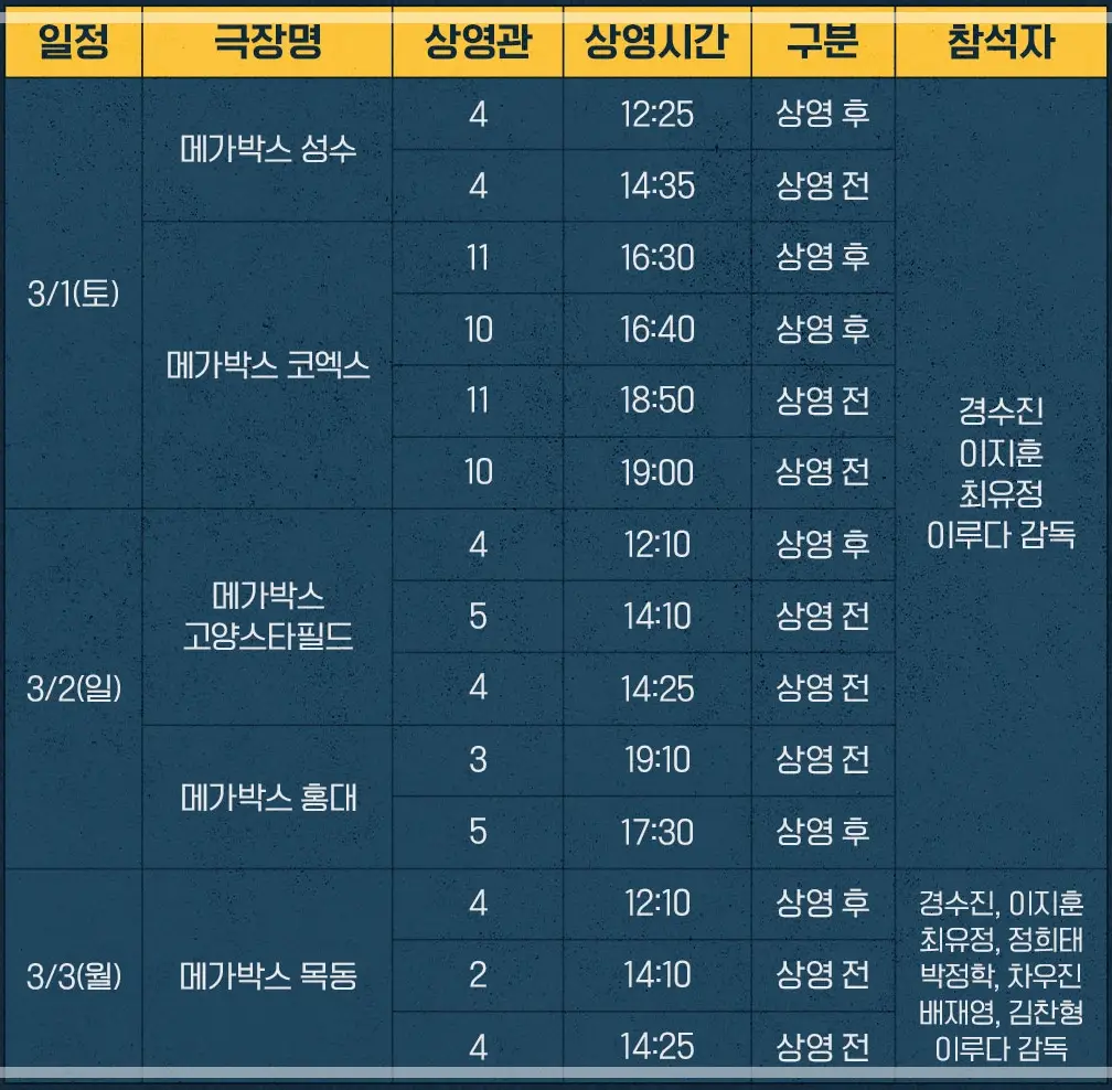 - 3월 1일 (토) : 메가박스 성수, 코엑스